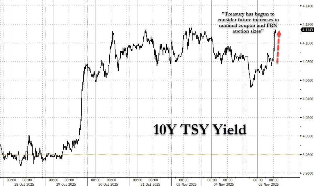 11月5日美国国债价格全线下跌,因财政部暗示扩大长债发行规模,且经济数据强劲削弱美联储12月降息预期。各期限美债收益率普遍上涨,市场对货币政策预期生变。