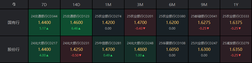 存单方面,今日6M国股报在1.61%的位置,1Y期国股报在1.63%的位置,较前一交易日下行0.83bp。二级存单方面,3M国股成交在1.47%附近,较前一交易日下行0.43bp,1Y国股成交在1.6375%位置,较前一交易日下行0.25bp。