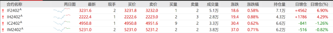 截至今天中午收盘时,沪深300股指期货(IF)、上证50股指期货(IH)的主力合约持仓量继续增加,IF2402合约的持仓量今日已增加了6.9%。成交量方面,尽管与1月18日的单日成交量增幅相比有所下滑,但4个品种的成交量依然保持上涨趋势。其中,上证50股指期货IH和中证1000股指期货(IM)的成交量增长相对较多。
