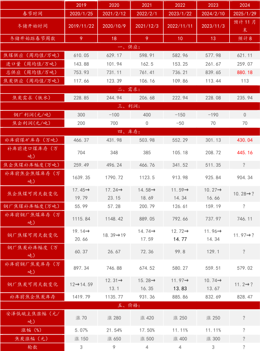 钢厂及焦化厂在春节前会进行硬性补库,这一行为通常发生在每年11月至次年1月。由于春节期间部分煤矿停产,而焦钢企业需连续生产,因此提前储备焦煤库存成为必要。此外,冬季极端天气可能影响运输效率,促使企业无论利润如何都会进行一定程度的补库,但力度因企业而异。这种短期集中补库行为对价格上涨具有推动作用,而当库存补至较高水平后,价格将有所回落。
