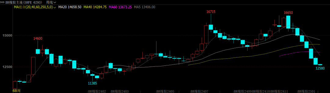 10月中旬以来,国内合成橡胶期货2501合约价格持续单边下跌,从16650元/吨的高点跌至12580元/吨,已连跌7周,累计跌幅高达24%。