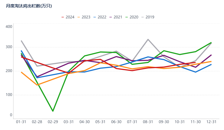 2. 钢联数据显示,11月份全国10个重点产区的19个代表市场淘汰鸡总出栏量为236.39万只,环比增加3.49%,淘汰鸡出栏量增加明显。由于前期蛋价处于较高水平,养殖盈利相对可观,因此养殖单位对淘汰鸡的出售意愿不强,导致养殖场不断延养,淘汰鸡出栏量有限,价格随之上涨。然而,随着蛋价和淘汰鸡价格的下跌,蛋鸡养殖盈利略有减少,养殖单位对后市的预期收窄,惜售延淘情绪减弱,多选择在价格高位时顺势淘汰大日龄以及产蛋率偏低的蛋鸡,因此淘汰鸡出栏量呈现阶段性增加。