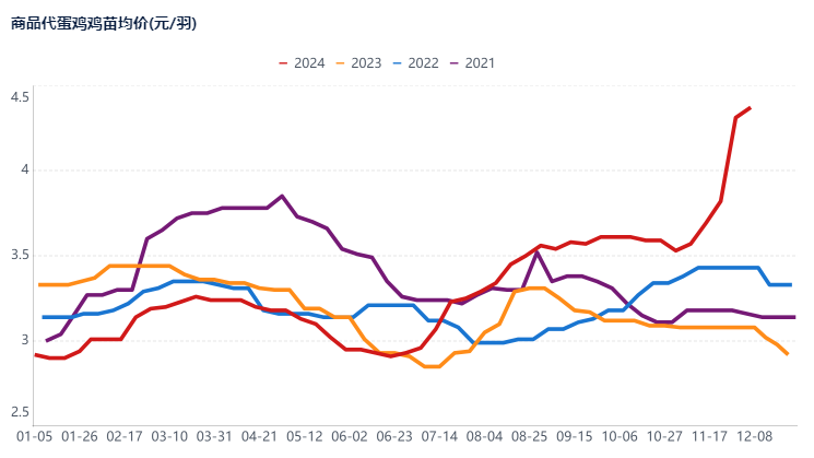 3. 尽管月内蛋价有所下滑,但养殖盈利依然可观,养殖端的补栏积极性尚可。部分种鸡企业的鸡苗供应量略显紧张,导致鸡苗整体价格达到年内新高。同时,由于淘汰鸡出栏量的增加,空栏栏位偏多,因此鸡苗的需求量较前期有所增加。然而,12月鸡苗市场虽仍有一定需求量,但目前鸡苗价格已涨至相对高位,终端养殖户对高价货源的接受度趋于谨慎,这可能会抑制鸡苗价格的进一步上涨。