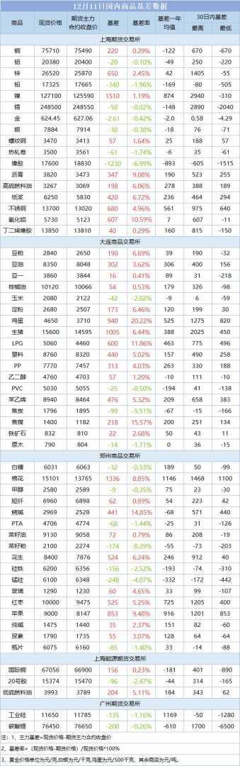 以下为12月11日国内商品期货市场的基差数据全面概览,该数据反映了现货与期货价格之间的差异,对于投资者判断市场趋势及制定交易策略具有重要意义: