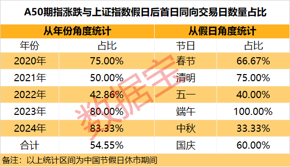 值得注意的是,在A股休市期间,如中国春节、端午节等节假日,A50期指的涨跌幅与A股假期后首个交易日的关联性较高,具备一定的预测性。此外,在A50期指盘前出现大涨大跌时,其对A股走势的影响也会显著增强。