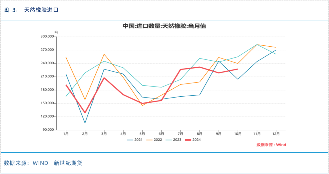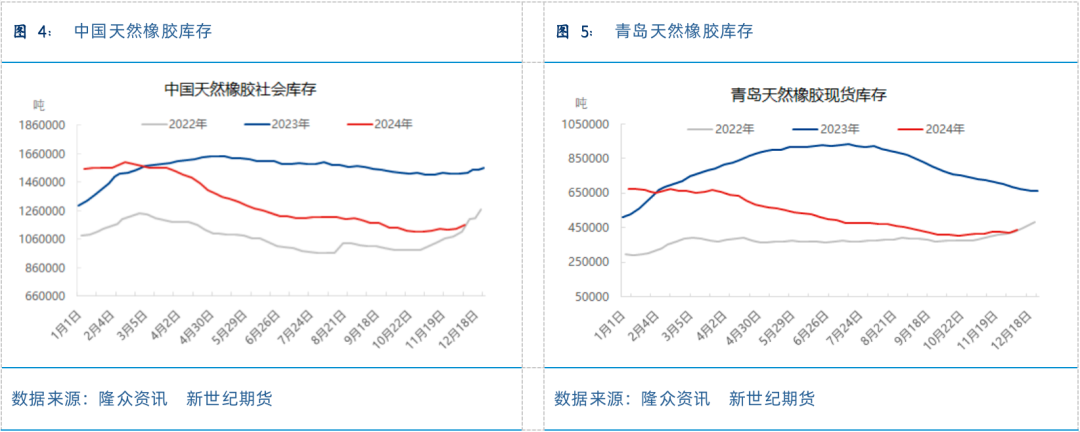 然而,对沪胶后市持乐观态度的依据同样存在。首先,原料产出受阻,原料胶水价格高企。泰南雨季的持续导致割胶及生产工作恢复缓慢,原料价格维持高位运行。国内销区可流通现货资源供应紧张,海南产区停割期逼近,外盘船货价格居高不下,持货商高价惜售,无意降价出货。其次,进口下降明显。据中国海关总署数据显示,1-11月中国进口天然及合成橡胶(含胶乳)总量同比下降10.1%,尽管11月份海外供应有所增加,但国内进口降幅更大,导致市场供应偏紧。再次,库存低位运行。尽管库存自低位有所反弹,但增长速率较低,累库压力尚不明显。交易所仓单也处于近年低位,实盘压力较轻。最后,下游产销顺畅。中国汽车工业协会数据显示,1-11月我国汽车产销同比分别增长2.9%和3.7%,其中11月同比分别增长11.1%和11.7%。轮胎生产也保持旺盛状态,年初增幅较大,随后也维持在高位。