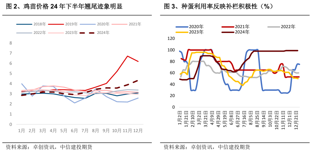 过去三年的养殖盈利导致现阶段养殖补栏意向积极,鸡苗需求高涨。同时,由于2023年引种缺口,鸡苗供应有所减少,2024年下半年鸡苗价格出现明显上涨趋势。从鸡苗采购情况看,2024年新引种的祖代鸡尚未形成大量实质性供应,多数鸡苗厂排单至3月份,少量至4月初。预计4月份订单需求将有所下调,鸡苗厂产能的恢复可能出现在2025年5、6月份以后,这与我们以上测算的祖代引种兑现节奏基本一致。展望2025年,我们认为存在较大的供给侧矛盾,主要基于2024年祖代引种量的判断。预计2025年存栏和产蛋效率将上行,过剩风险可能出现在下半年,鸡蛋远月合约存在较大分歧,市场存在跌破成本的潜在风险。