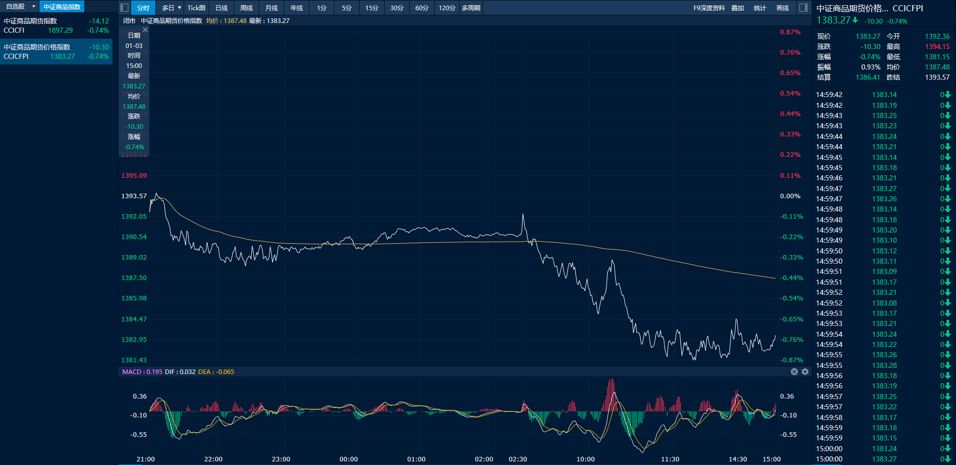 截至3日下午收盘,中证商品期货价格指数收报1383.27点,较前一交易日下跌10.3点,跌幅为0.74%。同时,中证商品期货指数也收报1897.29点,较前一交易日下跌14.12点,跌幅同样为0.74%。