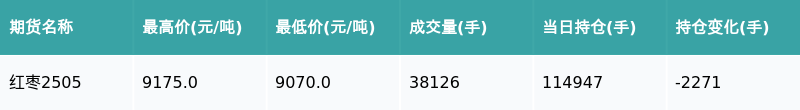 南方财经1月6日电,据南财金融终端盘后发布的最新期货数据显示,郑州商品交易所的红枣主力合约在当日交易中微幅收跌,具体跌幅为0.05%,最终收盘价格定格在9100.0元/吨。值得注意的是,该合约在交易日内出现了资金流出的现象,流出金额达到2479.93万元。这一数据变动可能预示着市场对于红枣期货未来走势的某种预期调整。以下是相关详细数据指标表格:
