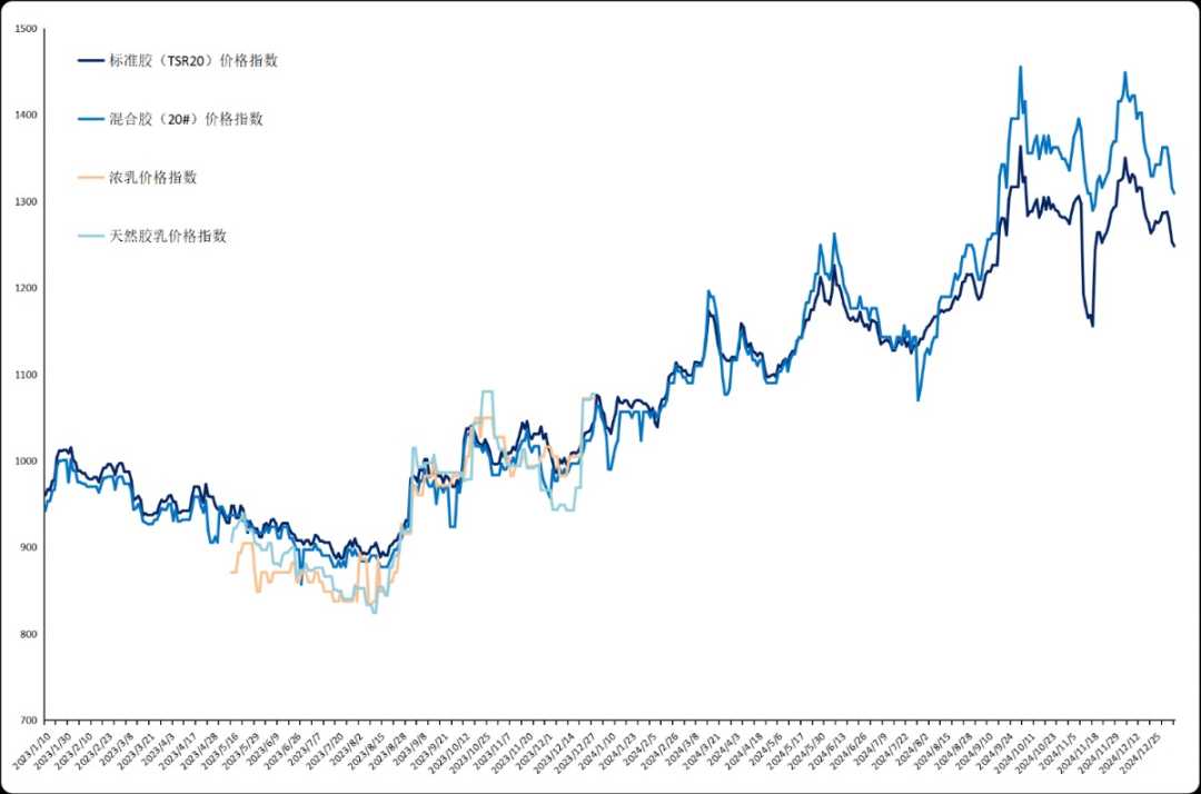截至1月6日,标准胶(TSR20)价格指数跌至1248.03点,与上一发布日(2024年12月30日)相比,跌幅达到了3.01%。同时,混合胶(20#)价格指数也报1309.13点,下跌了3.90%。从价格运行图来看,这一趋势清晰可见。