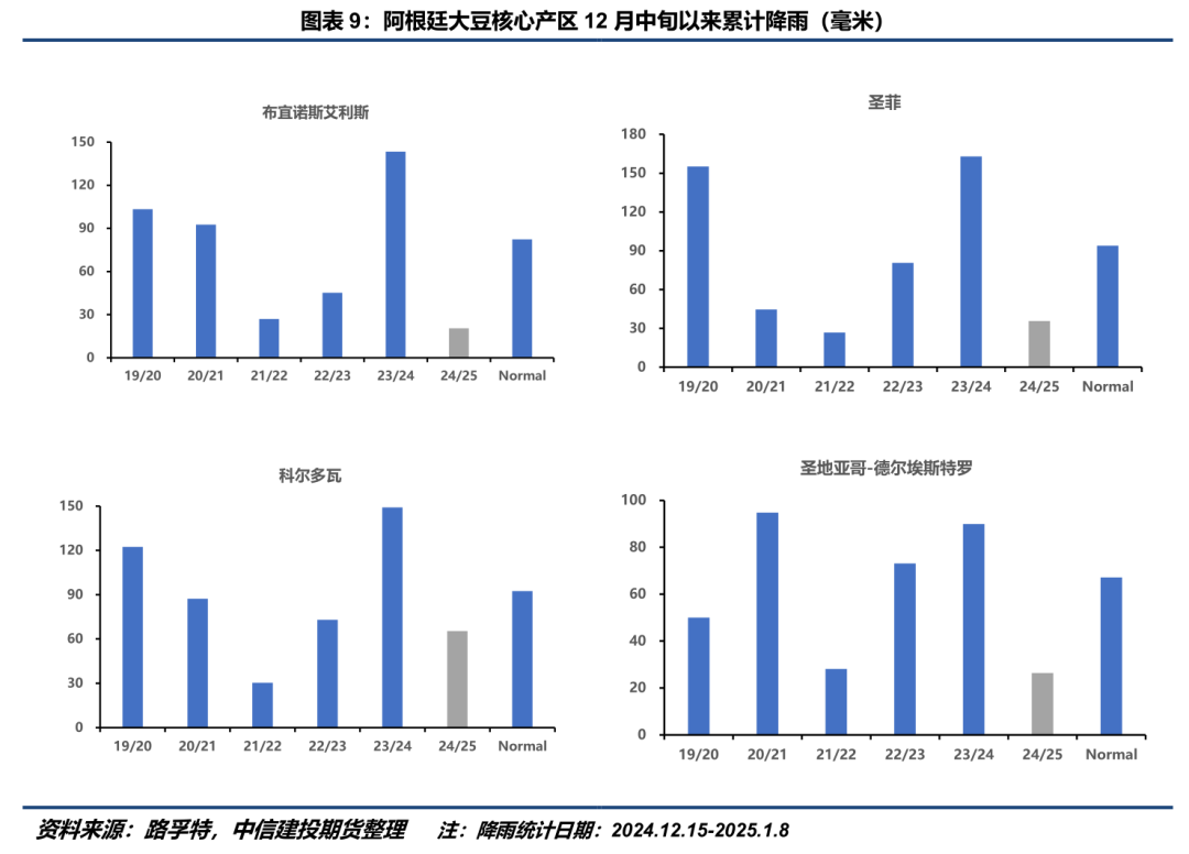 巴西大豆生长顺利,预计基本能够兑现产量。但巴西南部及阿根廷核心产区降雨偏少,引发市场对产量兑现的担忧。然而,中期预报显示未来有望降雨回归,市场博弈导致CBOT大豆震荡。若降雨改善,CBOT大豆面临回调压力;若降雨无改善,CBOT大豆将持续获得支撑,但总量视角下,供应增长限制反弹高度。