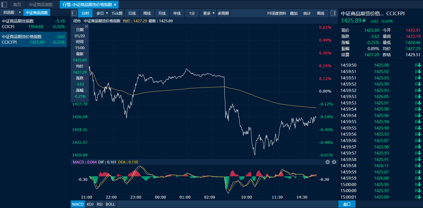截至20日下午收盘,中证商品期货价格指数报收于1425.89点,较前一交易日下跌3.62点,跌幅为0.25%;中证商品期货指数则报收于1954.68点,较前一交易日下跌5.18点,跌幅为0.26%。市场整体呈现震荡态势。