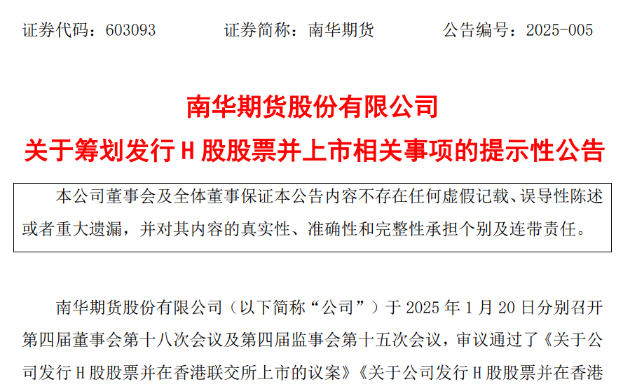 1月20日晚间,南华期货股份有限公司(简称南华期货)正式对外公告,公司董事会审议通过了关于发行H股并在港交所上市的系列议案,计划在全球范围内发行H股,并在港交所主板挂牌上市。