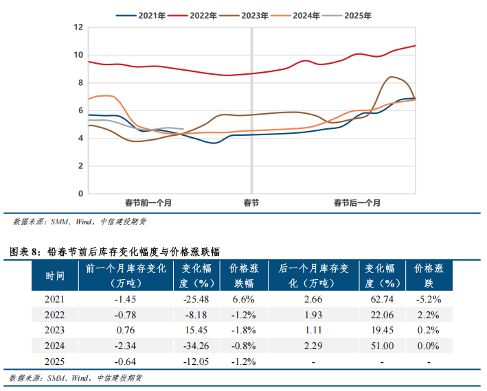 2025年铝的库存变化较小,节前出现逆季节性去库,显示出供需结构的改善,预示着节后价格有望上涨。