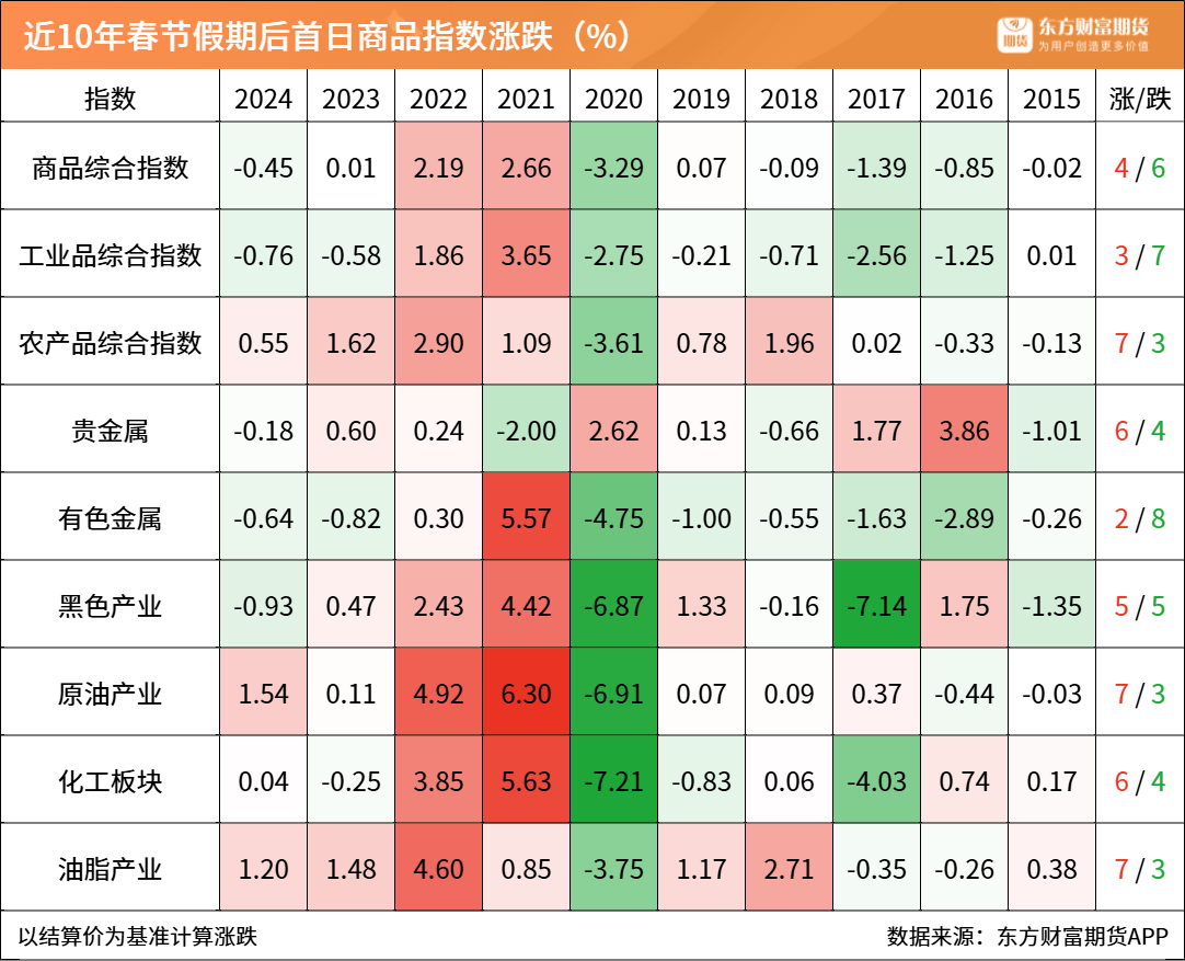 通过对近十年春节后首个交易日期货市场表现的深入分析,我们发现市场涨跌呈现出显著的波动性,受多重复杂因素影响。据统计,过去十年间,商品综合指数在节后首日共有4次上涨,6次下跌。进一步细分,工业品综合指数呈现3次上涨、7次下跌;农产品综合指数则相反,为7次上涨、3次下跌。具体到行业,原油产业与油脂产业展现出较强的上涨趋势,共上涨7次,下跌3次;而有色金属则表现不佳,仅上涨2次,下跌高达8次。