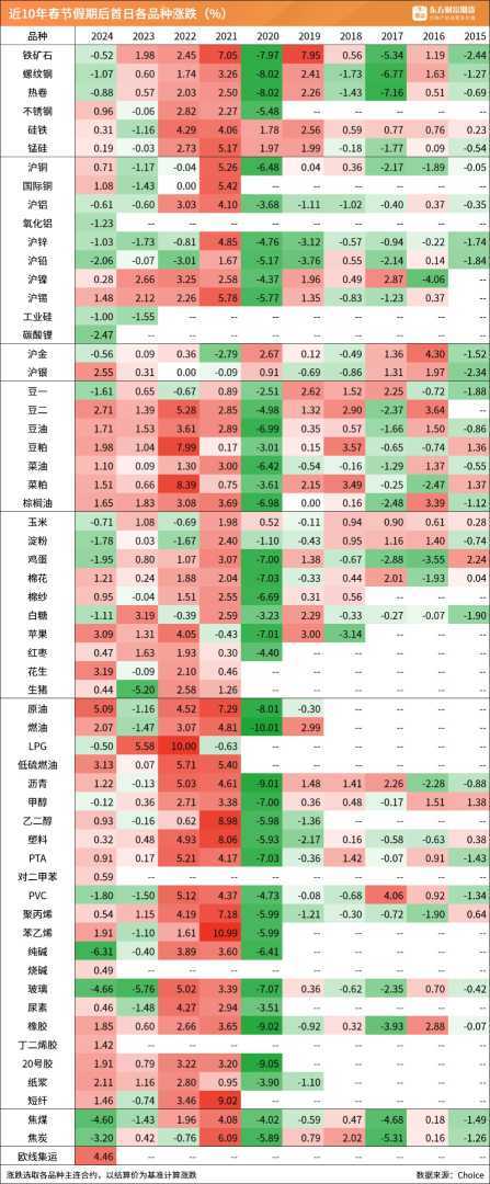 从具体品种来看,2020、2021及2022年节后首日多数期货品种价格波动剧烈,部分品种涨跌幅甚至超过7%;而到了2023、2024年,市场则趋于平稳,节后首日平均涨跌幅控制在1%以内。