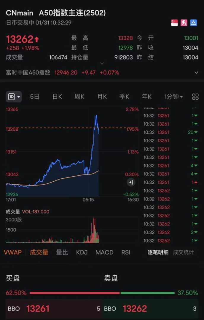 1月31日,富时中国A50指数期货盘中涨幅超过2.3%,外资机构对中国资产的关注度正在上升。中国经济数据积极,国际货币基金组织上调了中国2025年经济增长预期,为中国资本市场提供了广阔的投资空间。