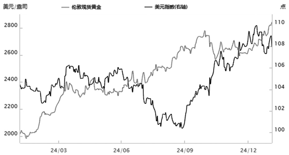 上图展示了2024年黄金价格与美债利率的走势对比。