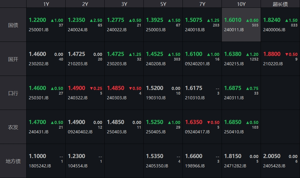 在银行间市场,主要利率债收益率多数呈现上行趋势。截至下午16:30,10年期国债活跃券240011收益率上行0.6个基点至1.601%,30年期国债活跃券2400006收益率上行1.5个基点至1.824%,而10年期国开活跃券240215收益率也上行1.2个基点至1.638%。