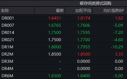 银银间市场回购定盘利率多数下行,FDR001报1.8300%,较上日上涨2个基点;FDR007报1.7500%,较上日下行5个基点;FDR014报1.7500%,较上日下行9.09个基点。银行间市场回购定盘利率也全线下行,FR001报1.8300%,较上日下行5个基点;FR007报1.8000%,较上日下行5个基点;FR014报1.8200%,较上日下行8个基点。