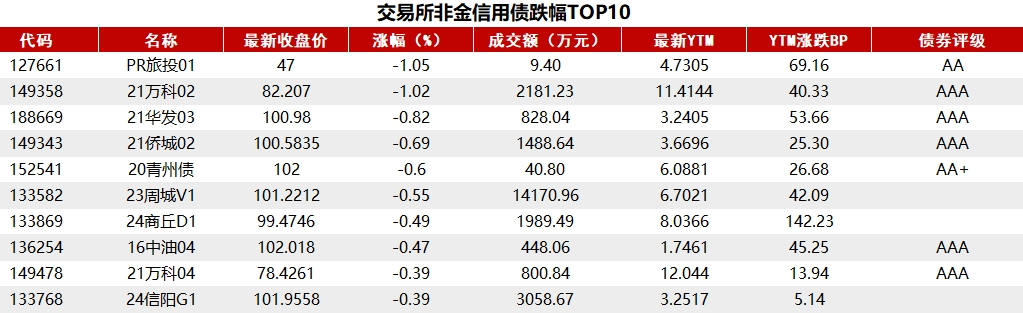 在信用债方面,据Choice数据统计显示,今日交易所市场非金融类信用债跌幅排行前五的债券分别是PR旅投01、21万科02、21华发03、21侨城02和20青州债。而涨幅排行前五的债券则分别是H9龙控01、H1碧地02、22万科07、24文蓝02和24杭湾01。