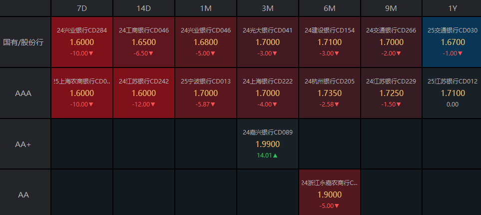 在存单市场方面,今日3个月期国股存单需求较好,利率在1.66%-1.73%之间,较前一日下行3个基点;1年期国股存单利率报在1.65%-1.72%之间,较前一日下行1个基点。AAA级存单方面,9个月期成交利率在1.725%,1年期成交利率在1.71%。