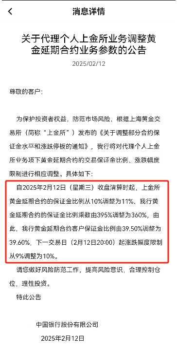 2025年2月12日起,中国银行和平安银行等多家银行根据上海黄金交易所通知,上调黄金现货合约保证金比例,并适度放宽涨跌幅限制,以防范市场波动风险。银行提醒投资者提高风险防范意识,合理控制仓位。