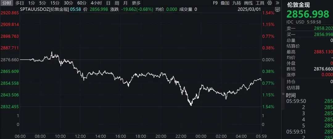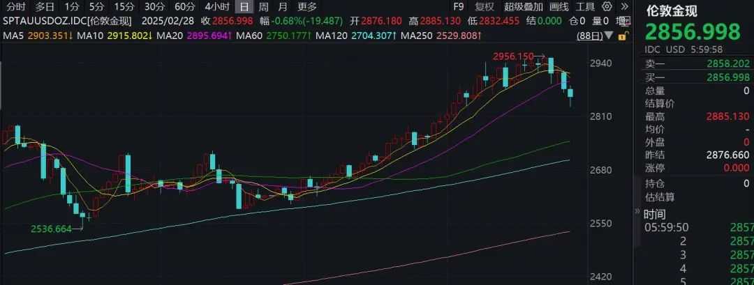 2月28日夜间,COMEX黄金价格一度跌至2832.5美元/盎司,较2月24日盘中创下的历史高点2974美元/盎司,跌幅超过4%。28日COMEX黄金期货收跌0.99%,报2867.3美元/盎司,本周累计下跌2.79%。