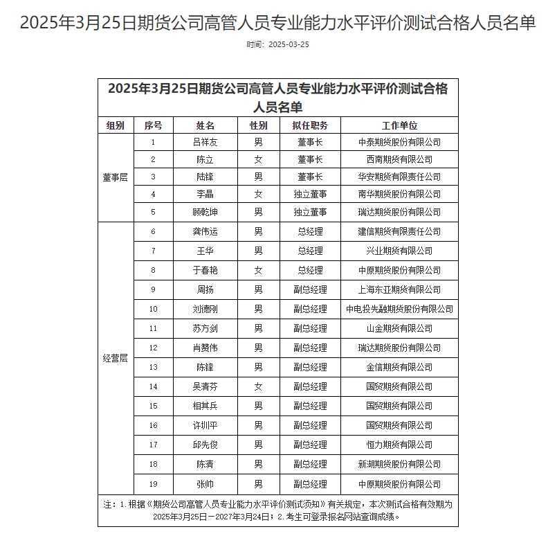 3月25日,中国期货业协会发布新一期期货公司高管人员专业能力水平评价测试合格人员名单,共19名高管人员上榜,包括中泰期货、西南期货、华安期货三家期货公司的拟任董事长。名单还涵盖了多位拟任总经理、副总经理及独立董事,标志着期货行业高管队伍专业能力提升。
