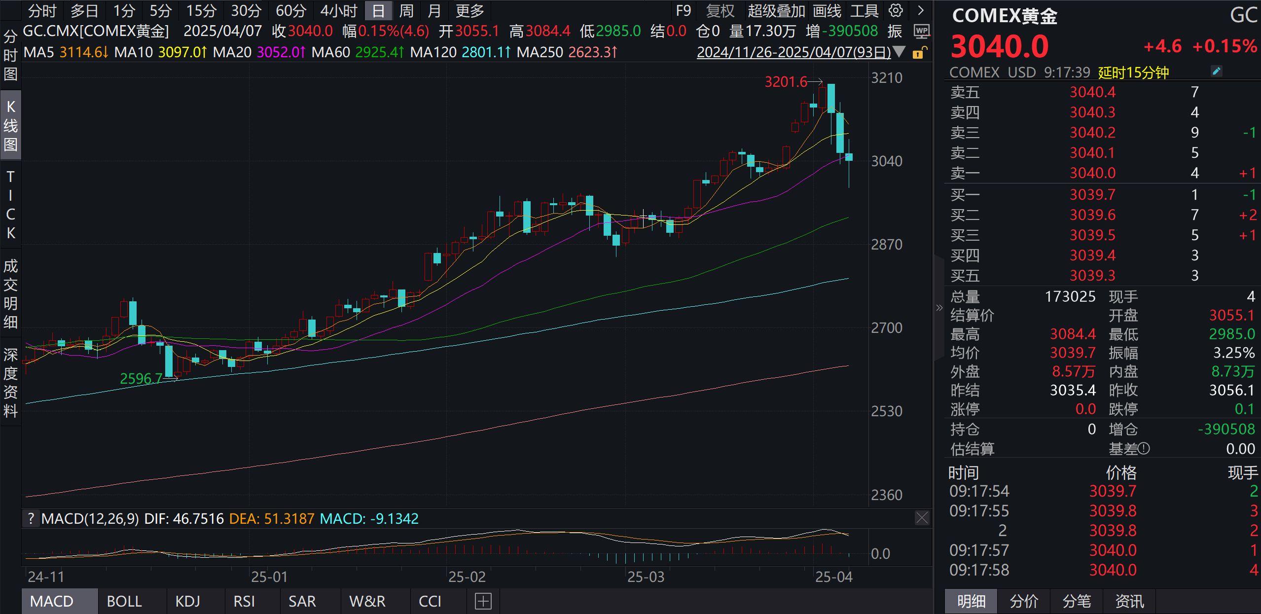 截至4月7日21时,COMEX黄金期货主力合约报价徘徊在3040.0美元/盎司附近,较4月初的历史最高点3201.6美元/盎司下跌约160美元/盎司。这一回调引发了市场的广泛关注。