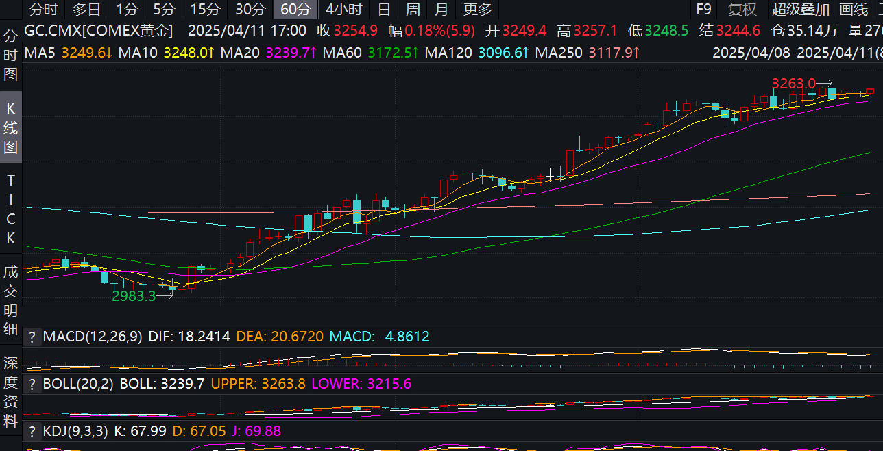北京时间4月13日,纽约商业交易所(COMEX)黄金期货再度创出历史新高,主力6月合约盘中最高点达3263美元/盎司。截至发稿,该合约报收于3255美元/盎司,国际黄金期价持续走强。