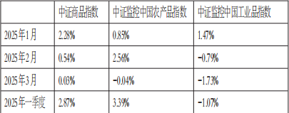 2025年一季度,大宗商品市场整体呈现震荡上涨态势,内部板块走势分化。中证商品期货指数上涨2.87%,农产品期货指数表现更佳,上涨3.39%,而工业品期货指数则下跌1.07%。