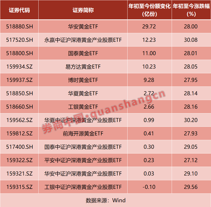 份额方面,年内华安黄金ETF份额增逾29.72亿份,其他多只黄金ETF产品也被资金不同程度地“加仓”。