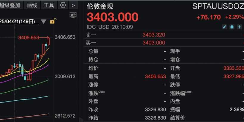 现货黄金价格继续走高,截至4月21日,伦敦金现涨幅扩大至2.29%,报3403美元/盎司,历史上首次站上3400美元/盎司关口,年初至今累计涨幅已超29%。上海黄金交易所黄金T+D同日收盘上涨2.26%,报803.98元/克,同样为历史上首次站上800元/克。国际金饰价格也稳稳站在千元之上,多家知名金店足金价格均突破1030元/克。