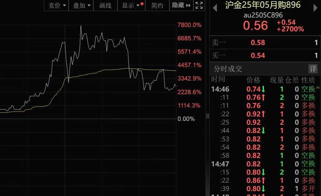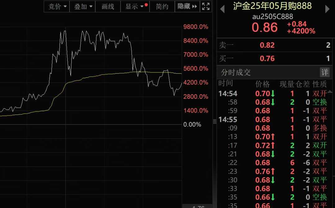市场反应热烈,4月22日,黄金价格持续飙升,引发期权市场“末日轮”效应。上期所沪金期权多张深度虚值认购合约价格暴涨,其中沪金2505购888最大涨幅达9800%,收盘涨幅仍高达4200%;沪金2505购896最大涨幅7000%,收盘涨2700%;沪金2505购904最大涨幅5500%,收盘涨2400%。
