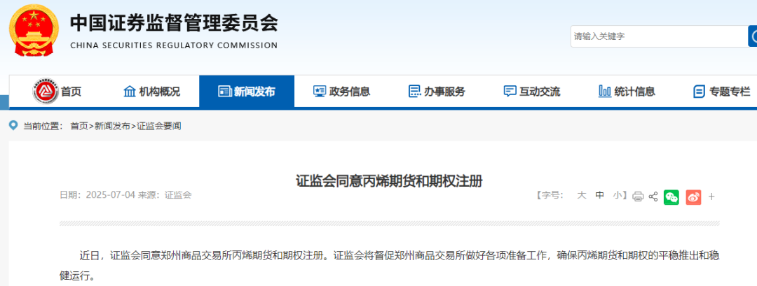 7月4日,中国证监会发布通知称,同意郑商所丙烯期货和期权注册。证监会将督促郑商所做好各项准备工作,确保平稳推出和稳健运行。