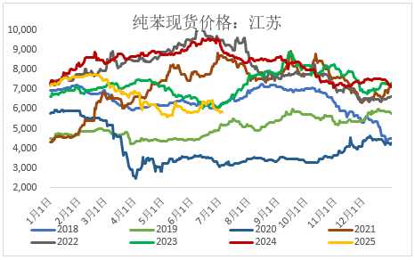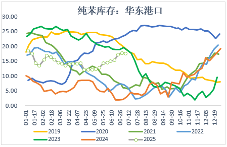 纯苯仍处于产能增速期,2024年我国产能增速7%,进口占比降至17%,进口来源45%左右来源于韩国。今年上半年国内产量累计增速6%,月均表观消费量在220-245万吨左右。目前国内港口库存处于累库中,同比中性略高,与前两年的节奏明显不同。