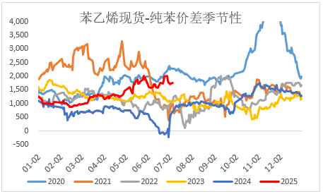 从跨品种价差来看,苯乙烯-纯苯现货价差目前1750元/吨附近,处于中性略高位置,考虑到该价差波动率与空间极大,谨慎起见等明显高估或者低估的时候再介入。