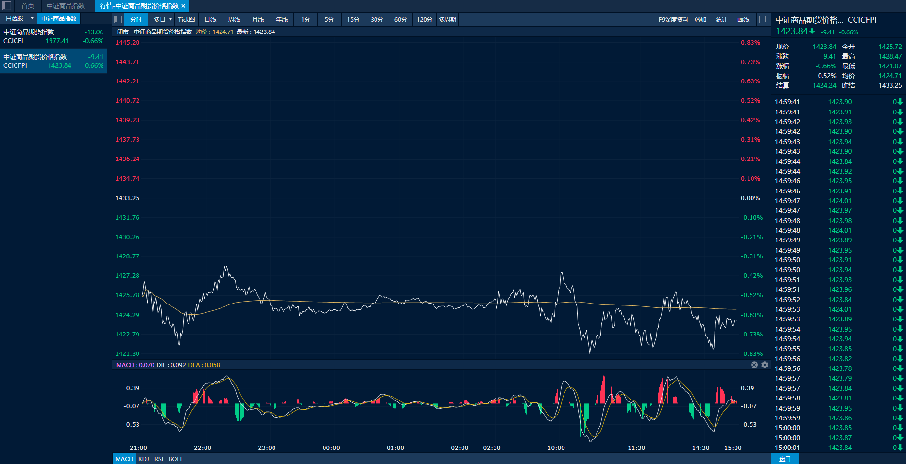 截至1日下午收盘,中证商品期货价格指数收报1423.84点,较前一交易日下跌9.41点,跌幅0.66%;中证商品期货指数收报1977.41点,较前一交易日下跌13.06点,跌幅0.66%。
