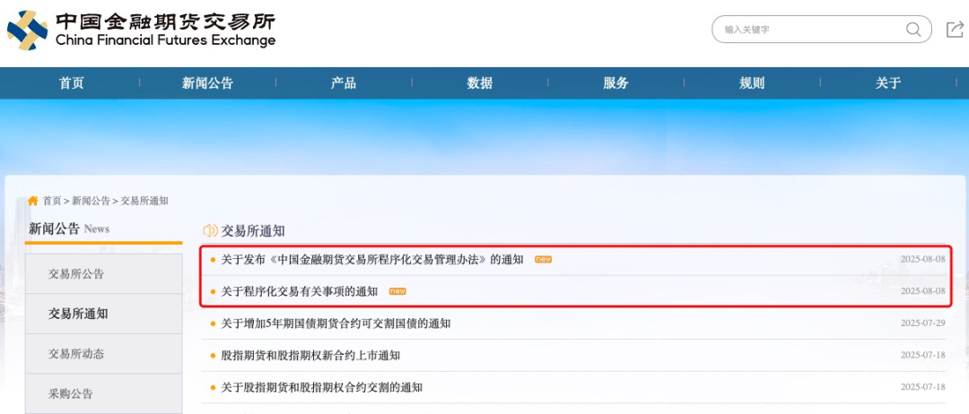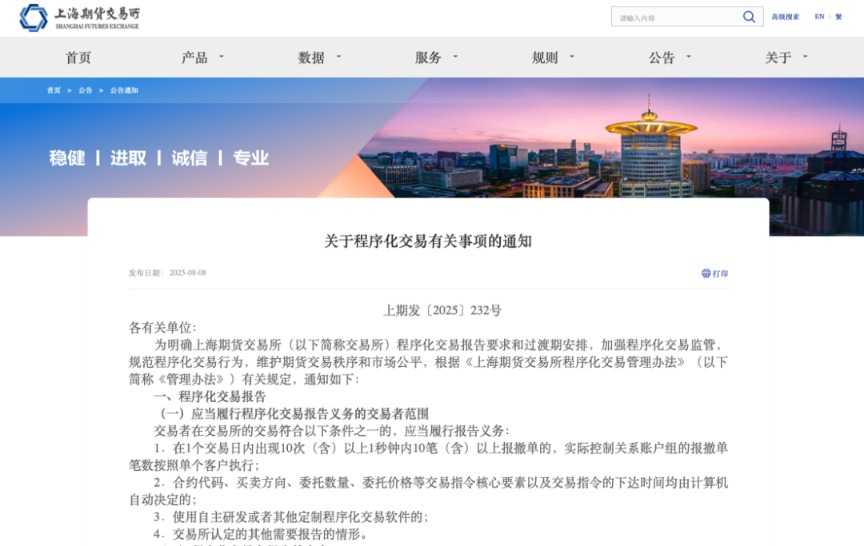8月8日,中金所、广期所、上期所、郑商所、大商所等五家期货交易所分别发布程序化交易管理办法,自2025年10月9日起实施,旨在落实中国证监会《期货市场程序化交易管理规定(试行)》(以下简称《管理规定》)各项监管要求,全面从严加强程序化交易监管,维护市场秩序和公平。