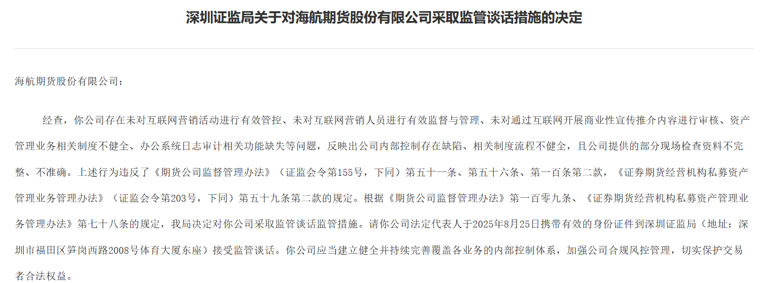 8月22日,深圳证监局对海航期货采取监管谈话措施,相关责任人被出具警示函。公司存在多项管理问题,反映出内部控制缺陷。监管部门严格监管,凸显期货行业合规重要性。