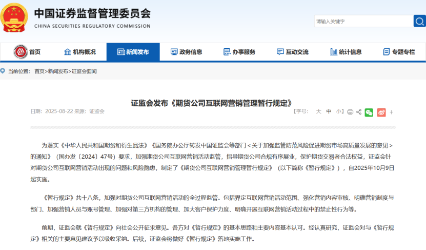 8月22日,中国证监会公告称,针对期货公司互联网营销活动出现的问题和风险隐患,证监会制定《期货公司互联网营销管理暂行规定》(以下简称《暂行规定》),自2025年10月9日起实施。此规定旨在加强期货营销监管,确保合规运营。