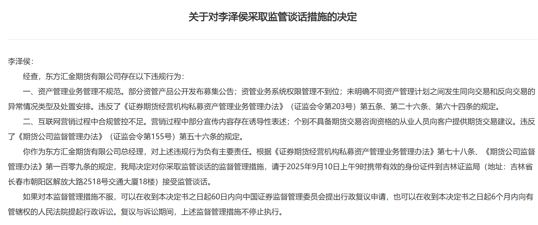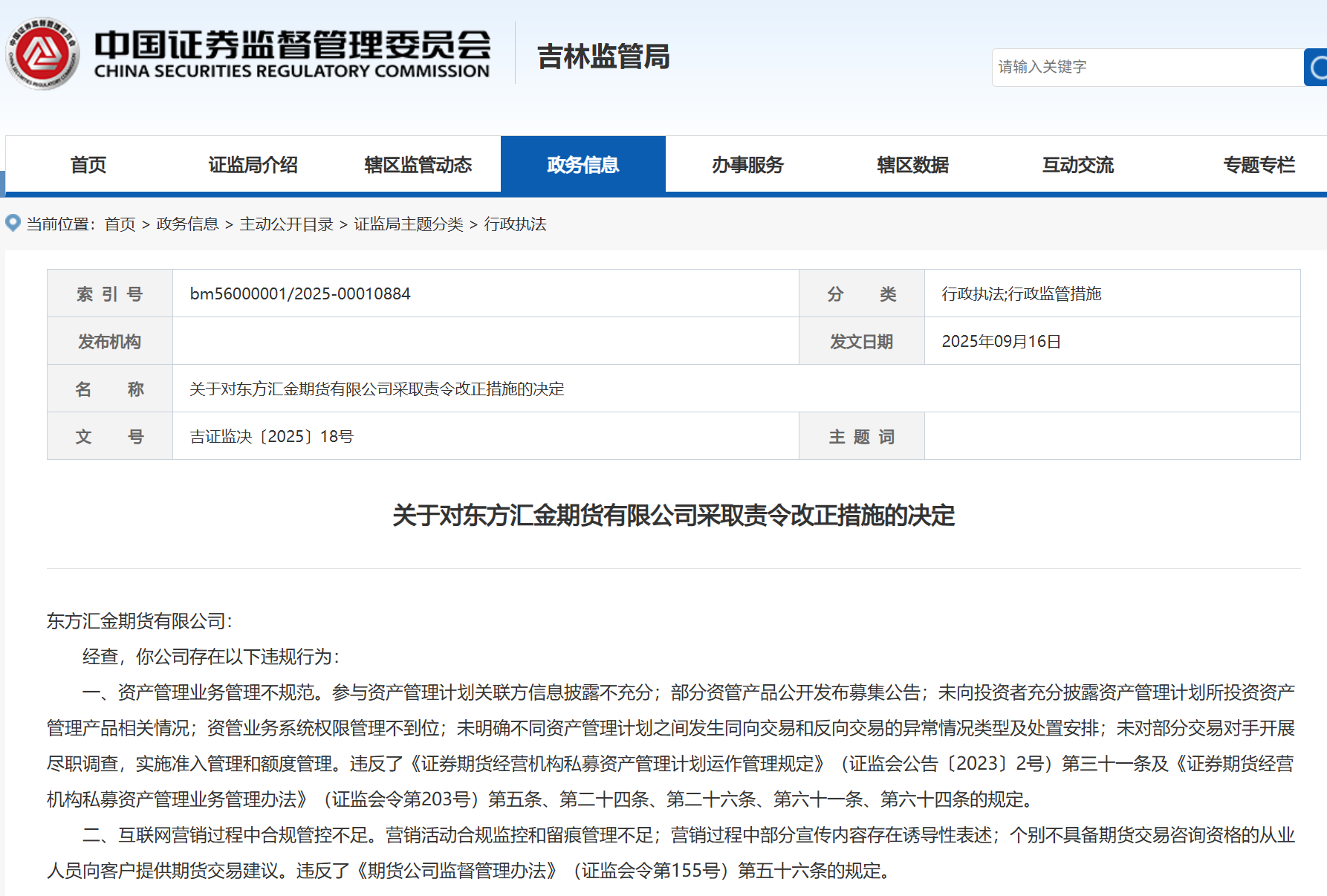 9月16日,吉林证监局发布关于对东方汇金期货有限公司采取责令改正措施的决定。根据该罚单,东方汇金期货在资管业务、互联网营销均存在违规的情形,合计提到9项违规行为,涵盖信息披露不充分、公开发布募集公告、未向投资者充分披露相关情况等资管业务问题,以及营销活动合规监控不足、宣传内容存在诱导性表述等互联网营销问题。