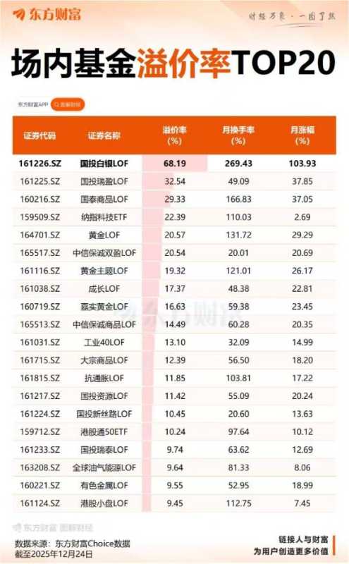12月24日,受白银价格再创新高提振,全市场唯一一只主要投资于白银期货的公募基金——国投白银LOF连续第三日涨停,周三单日溢价率已高达68.19%,位列场内基金首位。