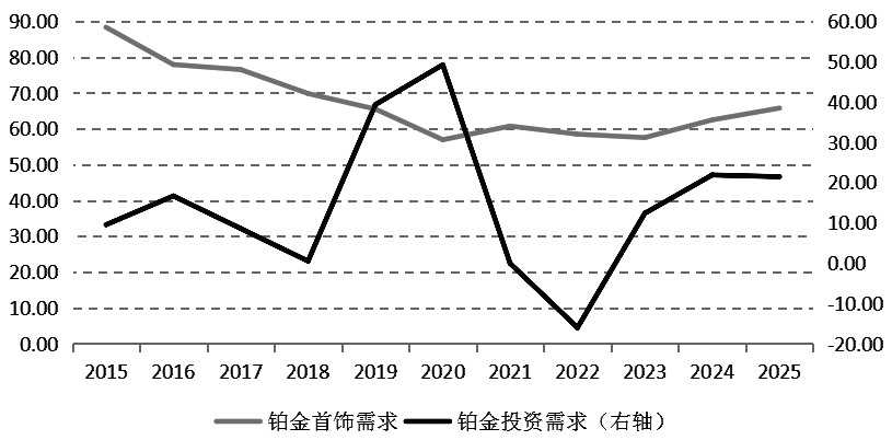 图为铂金的首饰需求和投资需求年度变化(单位:吨)
