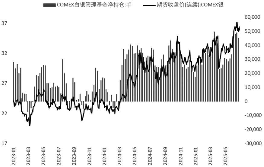 图为COMEX白银管理基金净多持仓与COMEX白银价格(单位:手、美元/盎司)