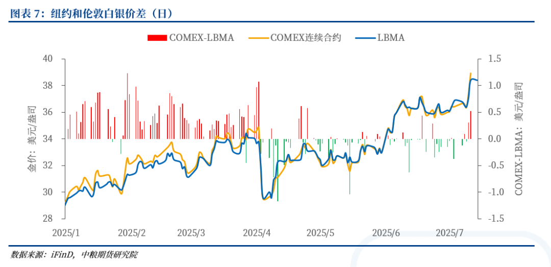 市场亦存在对潜在贸易风险的担忧,焦点集中于美国可能对从墨西哥进口的白银加征关税。墨西哥作为全球主要白银生产国之一,是美国白银进口的重要来源。尽管目前白银暂时获得美国关税豁免,但墨西哥其他商品仍面临30%关税的威胁。此外,美国已将计划对所有进口铜征收的关税提升至50%。然而,观察伦敦现货银价与COMEX近月合约的价差结构可见,当前并未重现4月份的情景(当时因关税担忧引发大量白银库存从伦敦流向美国,导致伦敦银价大幅高于纽约)。目前纽约与伦敦白银价差处于相对正常水平,暂未发现由关税担忧引发的显著贸易流异常。