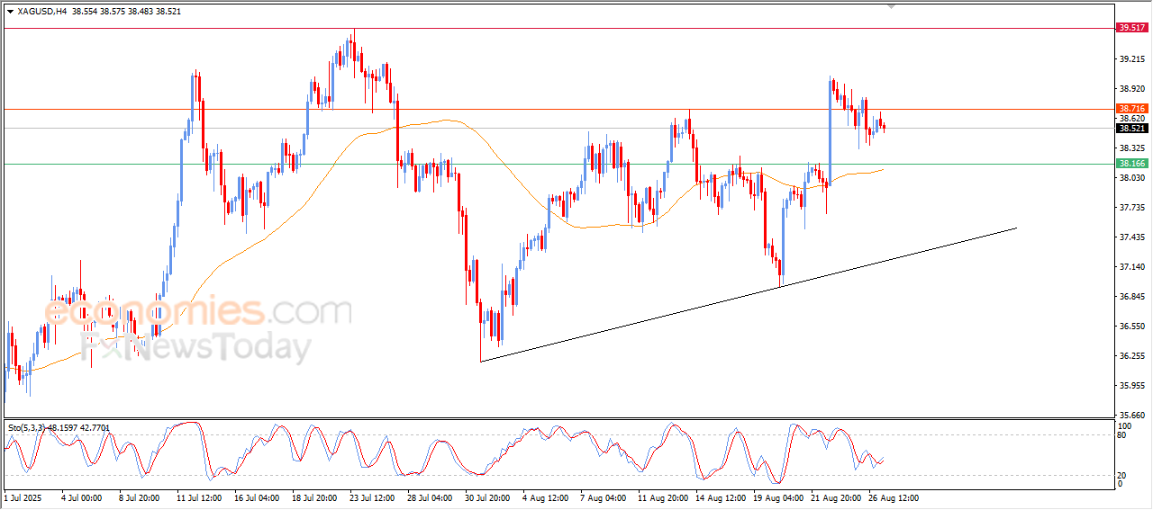 技术分析网站Economies.com观点,现货白银短线受阻38.70美元回落,但4小时图RSI指标回升及辅助偏向线支撑,为银价提供积极信号,将尝试突破阻力维持涨势。