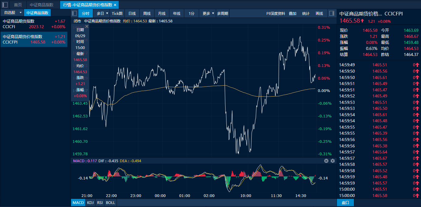 截至29日下午收盘,中证商品期货价格指数收报1465.58点,较前一交易日上涨1.21点,涨幅0.08%;中证商品期货指数收报2023.12点,较前一交易日上涨1.67点,涨幅0.08%。