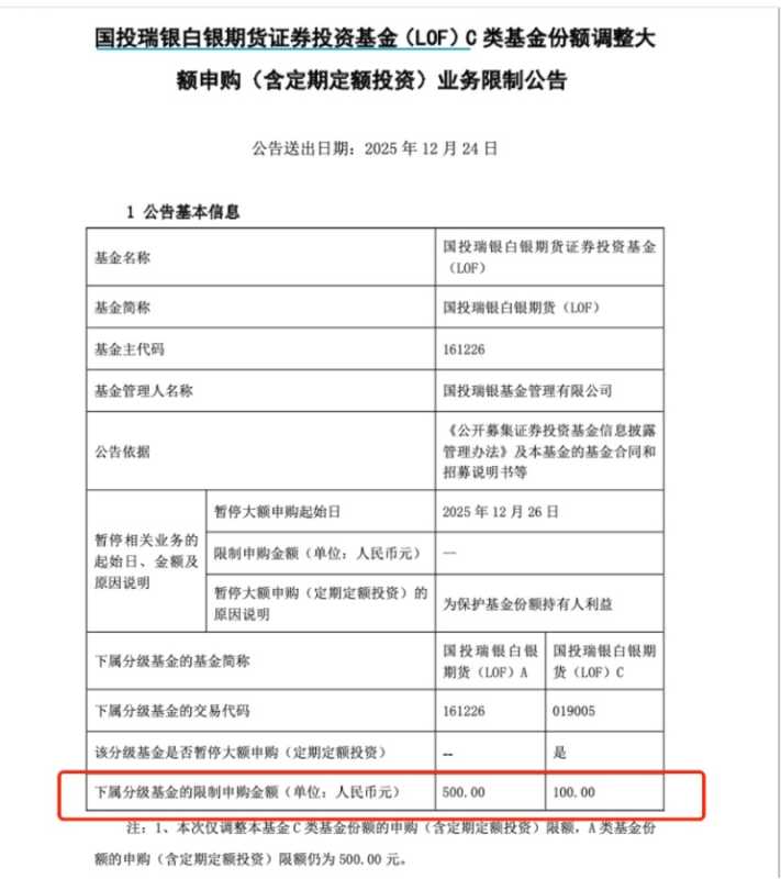 10月15日,国投白银LOF基金公告称,A类份额及C类份额的定期定额投资金额上限分别为6000元和40000元;10月20日,国投白银LOF基金再次发布公告,继续收紧了限购金额,A类份额及C类份额的定期定额投资金额上限分别为100元和1000元;12月19日,国投白银LOF基金发布公告,将A类份额及C类份额的定期定额投资金额上限分别调整为500元和500元。